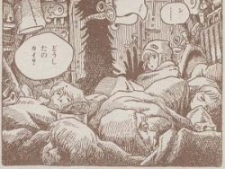 またケチャの「泣く人ひとりもいない」という台詞から、ナウシカに蹴りをくらった先の土鬼戦士オジルの死亡が判明。マスクが外れて瘴気にやられたか。(コマのスミで地味にもがいてたのに気付かれただろうか)